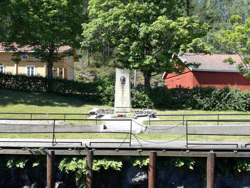 In 1836, 150 years after his birth, a bauta over him was builded at the upper lock chamber in Ørje Sluser. An oval bronze plant with a real portrait of Engebret Soot is mounted on the upper part of the support's smooth - cut front part. Below we find the channel builder's name, year of birth and year of death. Further down are mentioned Soots canal (Grasmokanalen), Otteid canal and Fredrikshalds canal, waterways where Soott, performed canalization work that was very important in his time. It was Fredrikshald's canal company that builded the monument.